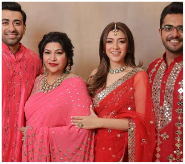 शादी के बाद नई दुल्हन ने माता की चौकी रखी, जिसकी तस्वीरें सोशल मीडिया पर तेजी से वायरल हो रही हैं। इन तस्वीरों में हंसिका सुर्ख लाल रंग की साड़ी में किसी अप्सरा से कम नहीं लग रही हैं।