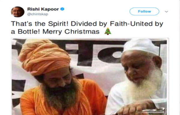 क्रिसमस के मौके पर सभी बॉलीवुड की सभी हस्तियों ने अपने प्रशंसकों को क्रिसमस पर विश किया। वहीं अपने ट्वीटस को लेकर चर्चा में रहने वाले अभिनेता ऋषि कपूर ने भी अपने फैंस को क्रिसमस पर विश किया और एक फोटो भी डाली। इस फोटो के साथ ऋषि कपूर ने लिखा—इसे कहते हैं भावना, धर्म से अलग लेकन बोतल से एक हैं सब, मैरी क्रिसमस।