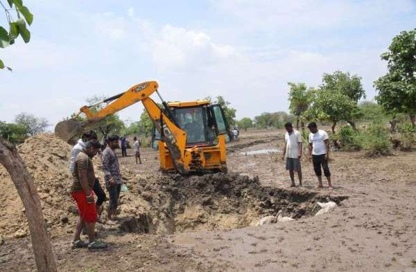 चित्तौैडग़ढ़ जिले के गायरीखेड़ा गांव के तालाब में मरी भेड़ो को जेसीबी के सहारे खड्डा खोद दफनाते हुए।
