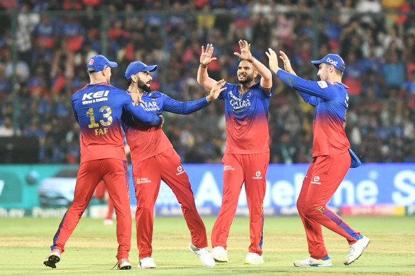 गुजरात टाइटन्स के विकेट गिरने का जश्न मनाते आरसीबी के खिलाड़ी।