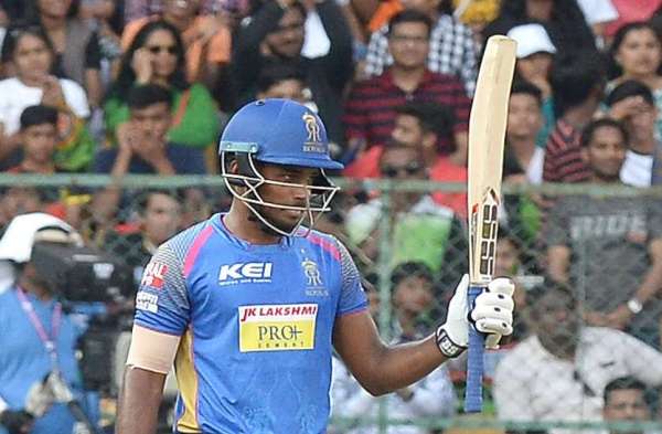 राजस्थान रॉयल्स की जीत के हीरो संजू सैमसन शानदार शॉट लगाने के बाद गर्व से बल्ले को दिखाते हुए। फोटो- बी.वी.विजयकुमार