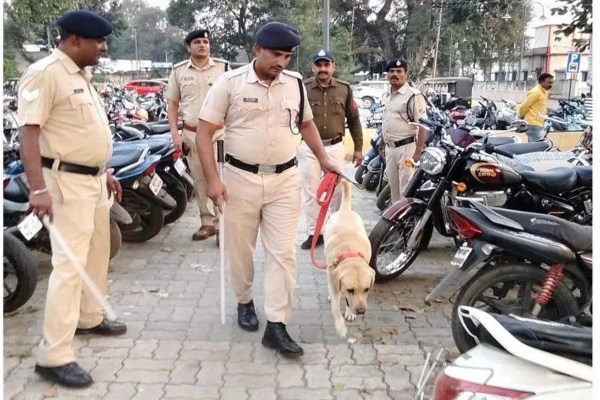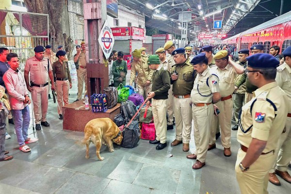 जयपुर में रेलवे स्टेशन पर डॉग स्क्वायड से जांच करवाते पुलिस अधिकारी। फोटो— अनुग्रह सोलोमन