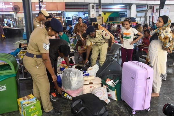 चेन्नई में रेलवे स्टेशन पर यात्रियों की सुरक्षा सुनिश्चित करने के लिए अतिरिक्त पुलिस बल तैनात किया गया।सामान की जांच तथा निगरानी को बढ़ा दिया गया। फोटो— हरिहर कृष्णन