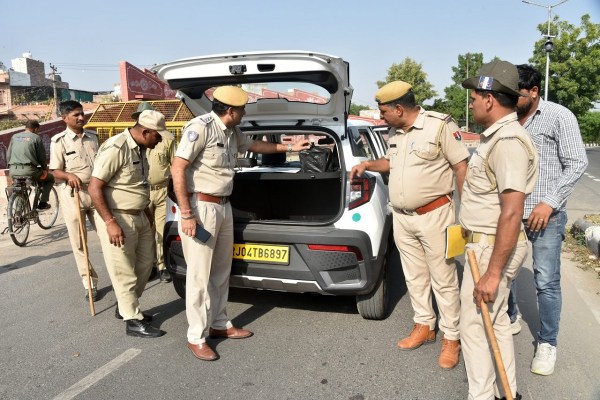 जोधपुर एयरपोर्ट रोड पर एयरपोर्ट थाने के सामने सुरक्षा की दृष्टि वाहनों की जांच करते पुलिस अधिकारी। फोटो— एसके मुन्ना