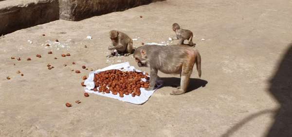 मेहंदीपुर बालाजी मंदिर परिसर में भोजन करते बंदर।