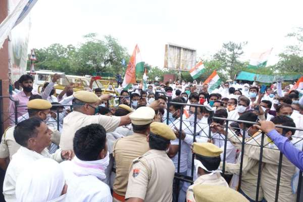 दौसा. कलक्ट्रेट में प्रवेश का प्रयास कर रहे कांग्रेस कार्यकर्ताओं को रोकती पुलिस।