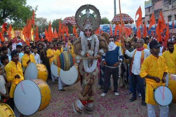 हनुमान जन्मोत्सव पर अलवर शहर में निकली ध्वज शोभायात्रा में हनुमान जी के रूप में कलाकार। फोटो: अंशुम आहूजा