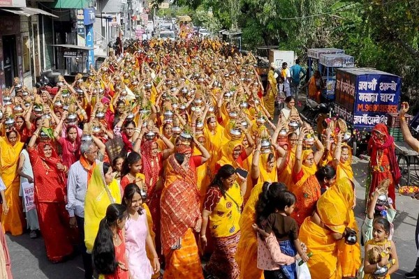 पाली शहर में हनुमान जयंती पर निकाली गई कलश यात्रा में शामिल महिलाएं व रथ पर सवार संत। फोटो : सुरेश हेमनानी
