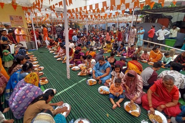 भोपाल में हनुमान मंदिर में दर्शन करने के बाद भण्डारा जीमते हुए भक्त। फोटो— अजय शर्मा
