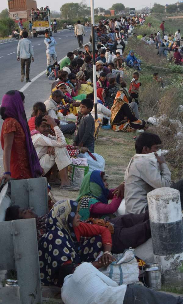 धौलपुर .देशभर में 21 दिनों के लिए लॉक डाउन के बाद राजस्थान और उत्तर प्रदेश की सीमा पर स्थित धौलपुर की बरेठा चेक पोस्ट पर सीमा सील होने के बाद खेतों में खड़े देश के विभिन्न शहरों से पलायन करके आए लोग पलायन करके आए लोगों के साथ महिलाएं एवं छोटे-छोटे बच्चे भी थे।