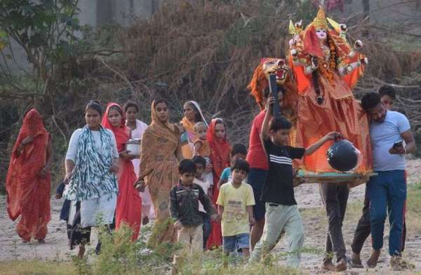 धौलपुर, नवरात्र के समापन की मौके पर मैया की प्रतिमा को विसर्जन के लिए चंबल नदी ले जाते श्रद्धालु