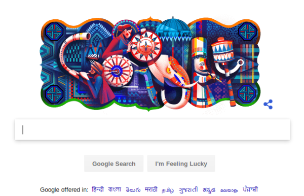 भारत के 69वें गणतंत्र दिवस के मौके पर गूगल ने अपने इस क्रिएटिव डूडल में बनाए गए महिला के चित्र में उसको प्रगतिशील चक्र लेकर चलते हुए दिखाया गया है। वहीं, पुरूष द्वारा वाद्ययंत्र बजाते हुए दिखाया गया है। यहां की कठपुतली कला को भी इसमें शामिल किया गया है। वहीं, हाथी का भी चित्र में शामिल करते हुए कई तरह की कलाकारी दिखाई गई है। आपको बता दें की भारत के इस गणतंत्र दिवस के माके पर एशिया के 10 दशों के राष्ट्राध्यक्ष मेहमान बने हैं। 69वें गणतंत्र दिवस की अध्यक्षता राष्ट्रपति रामनाथ कोविंद कर रहे हैं।