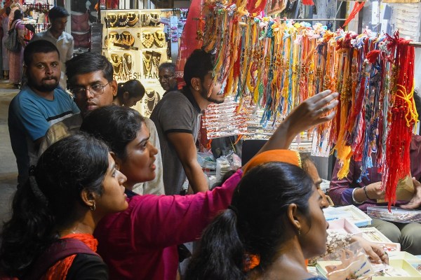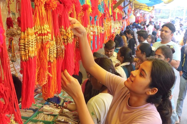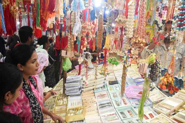 चेन्नई में राखी की एक दुकान पर राखियों की रौनक ग्राहकों को आकर्षित कर रही है। फोटो— हरिहर कृष्णन