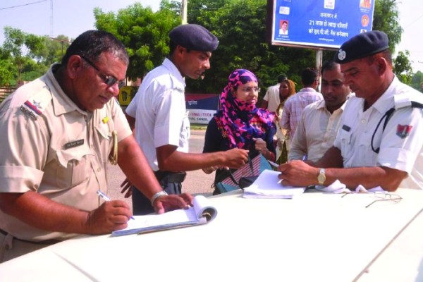 हनुमानगढ़ जंक्शन में गुरुवार दुपहिया सवार लोगों का चालान काटते यातायात पुलिस कर्मी।