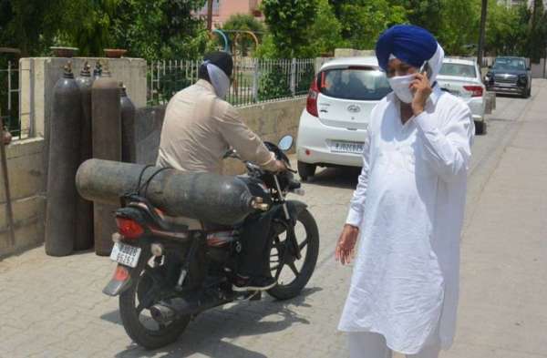 अलवर में कोरोना महामारी में ऑक्सीजन सिलेंडर की बढ़ती मांग और उपलब्धता कम को देखते हुए अलवर स्कीम नंबर दो गुरुद्वारा प्रबंधक कमेटी की ओर से निशुल्क ऑक्सीजन सिलेंडर का वितरण शुरू किया गया। फोटो: अंशुम आहूजा