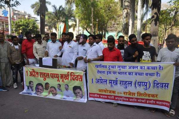 आज १ -अप्रेल को भारतीय युवा मोर्चा ने राहुल गाँधी को सोने के आलू बनाने वाले नाटक का मंचन कर मुर्ख दिवस मनाया