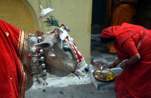 गौ माता का चॉदी आभूषण से श्रॅगार दीपावली के बाद गोर्वधन पूजन मे बल्देव बाग चेरीताल मे यादव सामाज के द्वारा गौ माता का एक किलो चॉदी के आभूषण पहनाकर श्रॅगार किया फोटो अफरोज खान