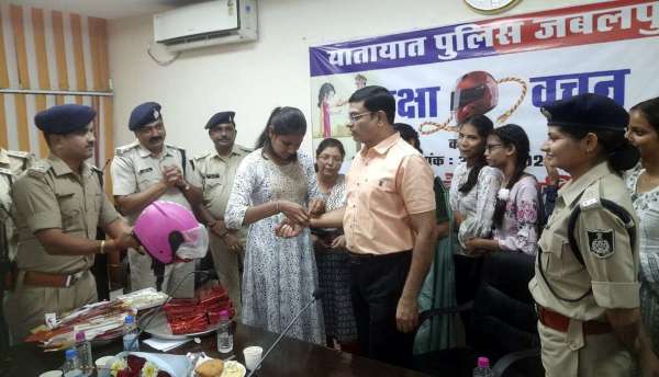 राखी मे हैलमेट का उपहार रक्षा बॅधन पर्व पर जबलपुर पुलिस कॅट्रोल रूम मे एक आयोजन मे एन सी सी एवॅ कालेज की छात्राओ ने एस पी सहित पुलिस अधिकारियो को राखी बॉधी बहनो को गिफट मे हैलमेट दिया गया फोटो अफरोज खान