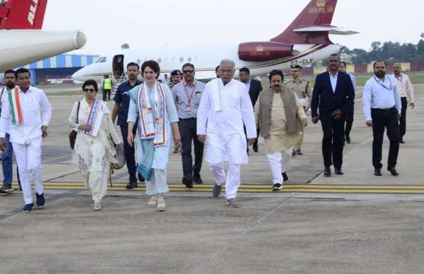 मुख्यमंत्री भूपेश बघेल और विशिष्ठ अतिथि प्रियंका गांधी जगदलपुर में 'भरोसे का सम्मेलन' में शामिल होने दन्तेश्वरी एयरपोर्ट पहुंचे स्थानीय जनप्रतिनिधियों ने गर्मजोशी के साथ अतिथियों का स्वागत किया।