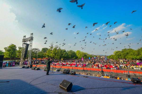 अलबर्ट हॉल पर कवि सम्मेलन के दौरान उड़ते कबूतर। फोटो अनुग्रह सोलोमन