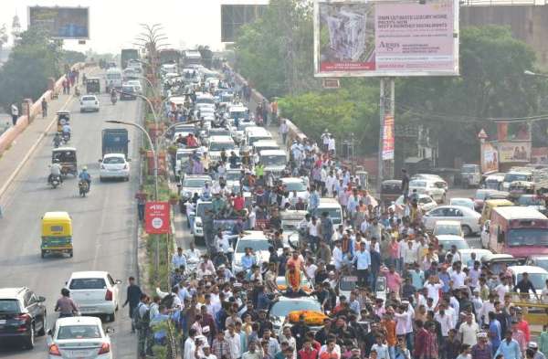 टोंक फाटक पुलिया से हनुमान बेनीवाल का रोड शो गुजरता हुआ।