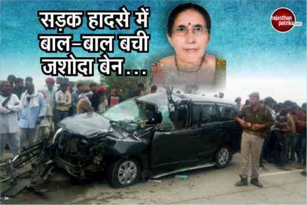 कार में सवार प्रधानमंत्री नरेंद्र मोदी की पत्नी जसोदा बेन गंभीर घायल हो गई, जबकि कार में सवार बसंत 67 पुत्र मांगीलाल मोदी की मौत हो गई। वहीं कार में सवार 6 वर्षीय बंशी एव कमांडो जयेंद्र घायल हुए है।