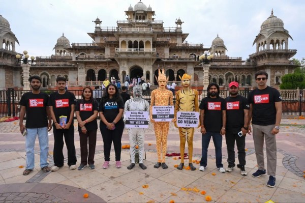 जयपुर के अल्बर्ट हॉल के सामने पेटा (पशुओं के साथ नैतिक व्यवहार के पक्षधर लोग) द्वारा प्रदर्शन किया गया। इस दौरान प्रदर्शनकारी द्वारा बॉडी पेंट का विगन अपनाने के लिए संदेश दिया गया। देखें तस्वीरें। सभी फोटोज अनुग्रह सोलोमन।