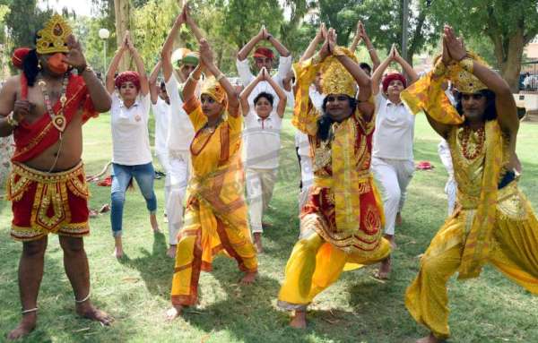 अन्तरराष्ट्रीय योग दिवस की पूर्व संध्या पर योग के महत्व को बताते हुए योगासन करते देवता। बीकानेर के गांधी पार्क में योग का अभ्यास कर रहे युवाओं के साथ राम दरबार की वेशभूषा में योग करते योग प्रशिक्षक। फोटो : जेके भाटी