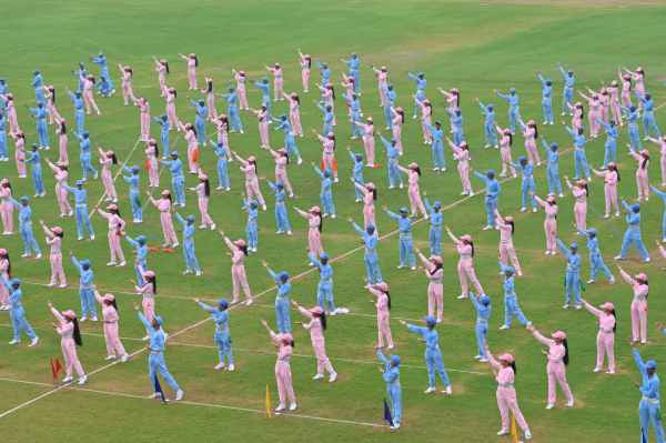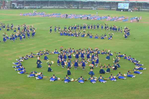 एसएमएस स्टेडियम में राज्य स्तरीय समारोह में प्रस्तुति देते स्कूली विद्यार्थी।