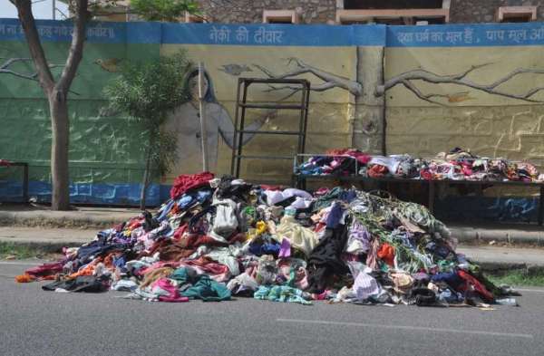 जयपुर के बजाज नगर में जरूरतमंदों के लिए पुराने कपड़ों को रखने के लिए नेकी की दीवार है। यहां पर इतने कपडे इकट्ठे हो गए की कपड़ों के ढेर सड़क तक आ गए।