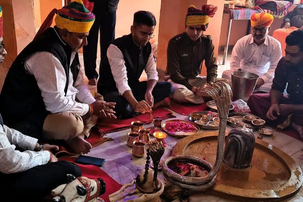 महादेव मंदिर में पूजा-अर्चना करते अधिकारी और जनप्रतिनिधि (फोटो: दीपक सोनी पत्रिका)