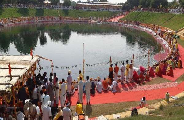 गौधाम कामधेनू सरोवर में लोगो के साथ पूजा-अर्चना करते सीएम
