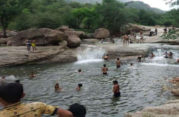 जसवंतपुरा के निकट स्थित खोड़ेश्वर महादेव परिसर में झरने में नहाने का आनंद लेते लोग।