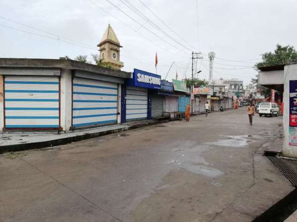 झालावाड़ में घंटाघर चौराहे पर जिला बंद के तहत मंगलवार को बाजार में फैला सन्नाटा व बंद दुकानें।