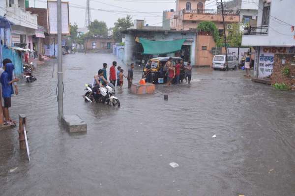 झालावाड़ में रविवार को बारिश के दौरान पुरानी रेल रोड पर भरे पानी में से गुजरते राहगीर।