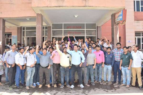 झालावाड़ में आंदोलन के तहत राजकीय एसआरजी चिकित्सालय में काम का बहिष्कार कर बाहर खड़े रेजीडेंट चिकित्सक। फोटो-जितेंद्र जैकी