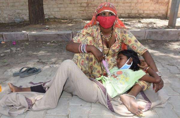 फुटपाथ पर बीमार बच्ची को गोद में लेकर बैठी मां