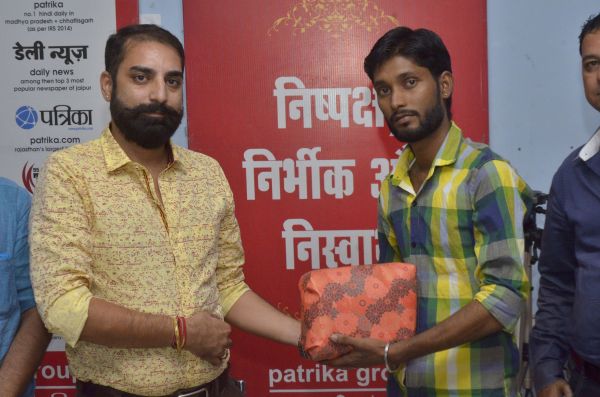 बासनी पत्रिका फेसबुक पेज की करवा चौथ बेस्ट फोटो कॉन्टेस्ट में प्रथम विजेता अशोक राठौड़ को पुरस्कार देते अर्हम् ज्वैलर्स सरदारपुरा के प्रो. दीपक मोदी।