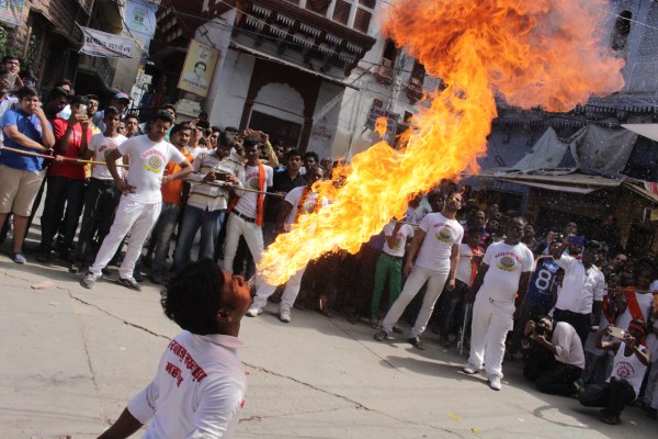 जुलूस के आगे अखाड़ों के उस्ताद व सदस्य शौर्य प्रदर्शन करते चल रहे थे।
