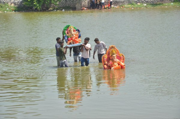 जलाशय में गणेश प्रतिमा का विसर्जन करते भक्त।