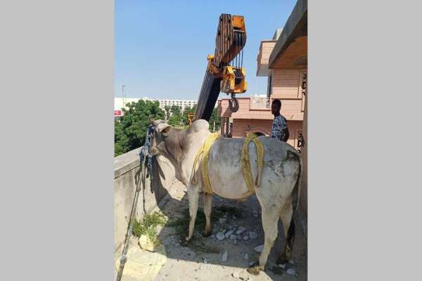 आखिरकार क्रेन बुलाई गई और साण्ड को रस्सी व पट्टे से बांधकर नीचे उतारा गया।