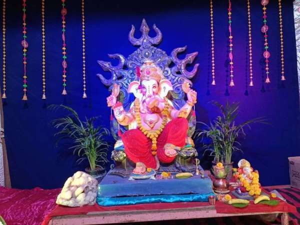 खंडवा. रामराज्य गणेश मित्र मंडल घंटाघर चौक खंडवा करीब 49 वां वर्ष 7 फीट गणेश प्रतिमा गणेश जी शंकर भगवान के त्रिशूल के आगे बैठे अध्यक्ष बंटी गंगराड़े , उपाध्यक्ष अजय वर्मा