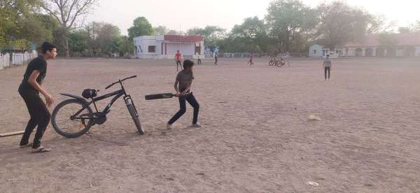 खंडवा. पुलिस लाइन स्थित हॉकी ग्राउंड पर हॉकी के खिलाडी नहीं सायकल का स्टम्प बनाकर लगाकर क्रिकेट खेलते बच्चे