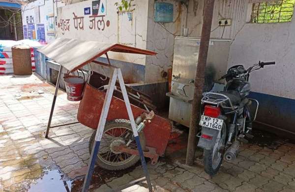 वाटर कूलर के आस-पास बाइक समेत अन्य सामग्री रखी ।