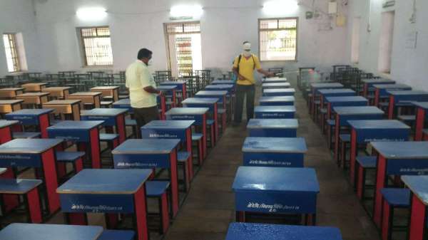 khandwa ~ परीक्षा के पूर्व हाल को सैनेटाइज करते नगर निगम कर्मी।