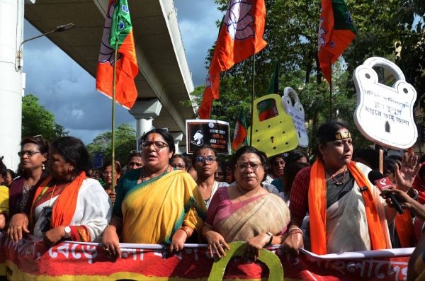 भाजपा की महिला मोर्चा की सदस्याएं विरोध मार्च में हिस्सा लेती हुईं।
