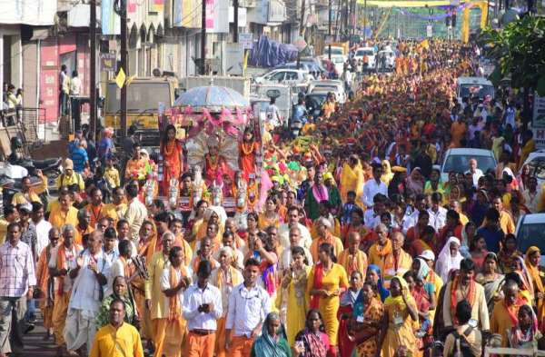 भगवा ध्वज के साथ श्रद्धालु।