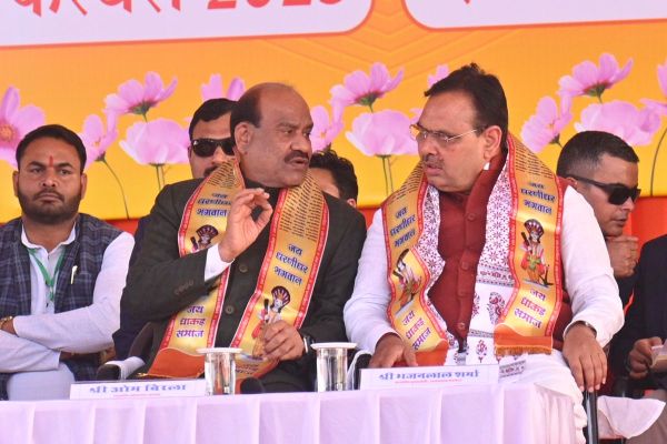 अधिवेशन में लोगों का अभिवादन करते लोकसभा अध्यक्ष ओम बिरला, मुख्यमंत्री भजनलाल शर्मा, शिक्षामंत्री मदन दिलावर, उर्जामंत्री हीरालाल नागर व अन्य