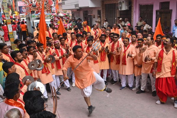 अनंत चतुर्दशी पर कोटा में निकली भव्य शोभायात्रा के दौरान त्रिशूल के साथ प्रदर्शन करता युवक।