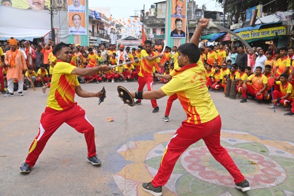 अनंत चतुर्दशी पर कोटा में निकली भव्य शोभायात्रा में अखाड़ेबाजी का प्रदर्शन करते युवा।